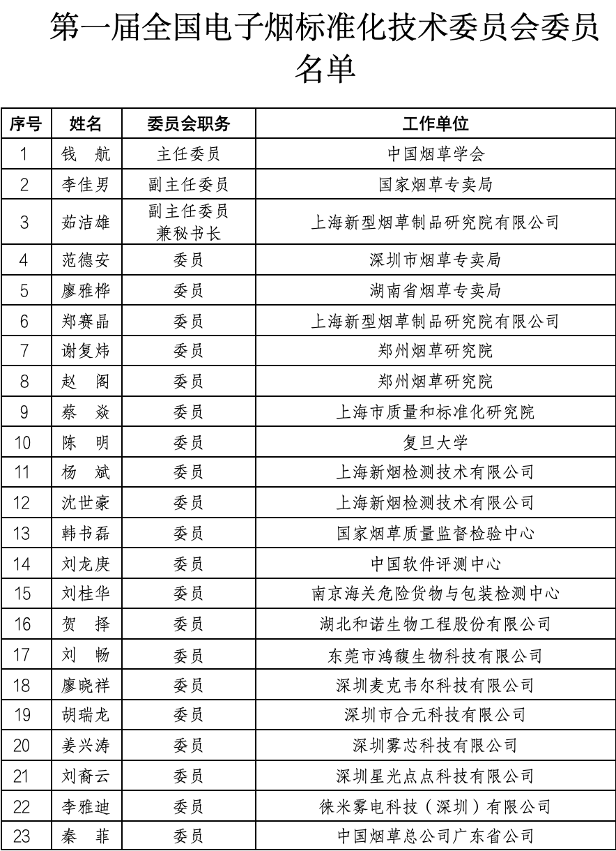第一届全国电子烟标准化技术委员会拟由30名委员组成(委员名单见附件),钱航任主任委员,李佳男任副主任委员,茹洁雄任副主任委员兼秘书长,秘书处由上海新型烟草制品研究院有限公司承担。