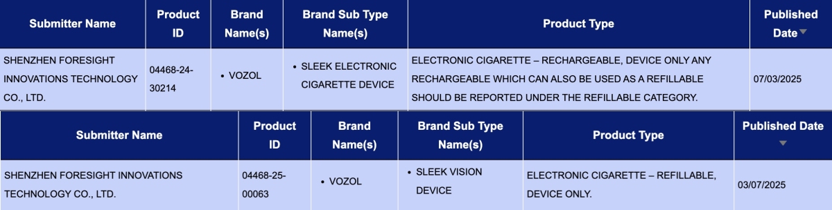 2FIRSTS查询英国药品与健康产品管理局(MHRA)的通告数据库了解到,“VOZOL SLEEK”相关设备“SLEEK VISION DEVICE”和“SLEEK ELECTRONIC CIGARETTE DEVICE”已分别在“ELECTRONIC CIGARETTE – REFILLABLE, DEVICE ONLY.”(可注油电子烟设备)和“ELECTRONIC CIGARETTE – RECHARGEABLE, DEVICE ONLY ANY RECHARGEABLE WHICH CAN ALSO BE USED AS A REFILLABLE SHOULD BE REPORTED UNDER THE REFILLABLE CATEGORY.”(可充电电子烟设备)两个产品类别中进行公示,公示时间分别为2025年7月3日和2025年3月7日。