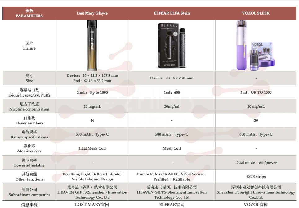 • 差异化卖点:LOST MARYGlayce拥有可视油仓、46款口味;ELFBAR ELFA Stein采用限量设计与兼容全ELFA系列烟弹(含预填充与开放式);VOZOL SLEEK搭载双档功率与灯效。