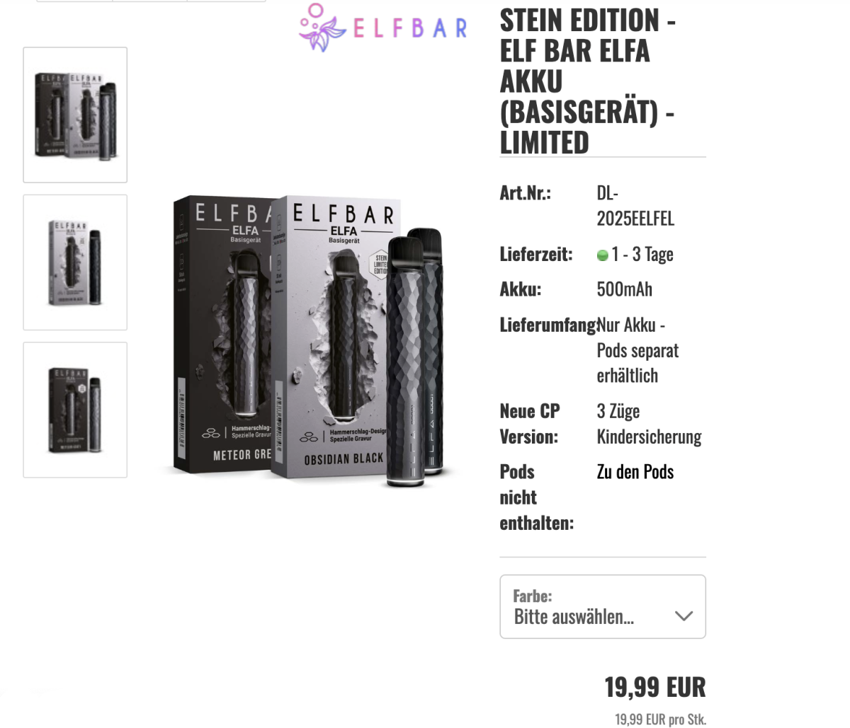 ELFBAR ELFA Stein限量版产品销售页面显示售价19.99欧元|图源:dampflager