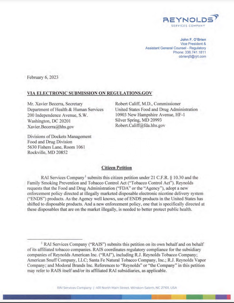 雷诺烟草提交了一份公民请愿书,要求美国食品和药物管理局(FDA)针对非法销售一次性电子烟产品问题制定强制法规。
