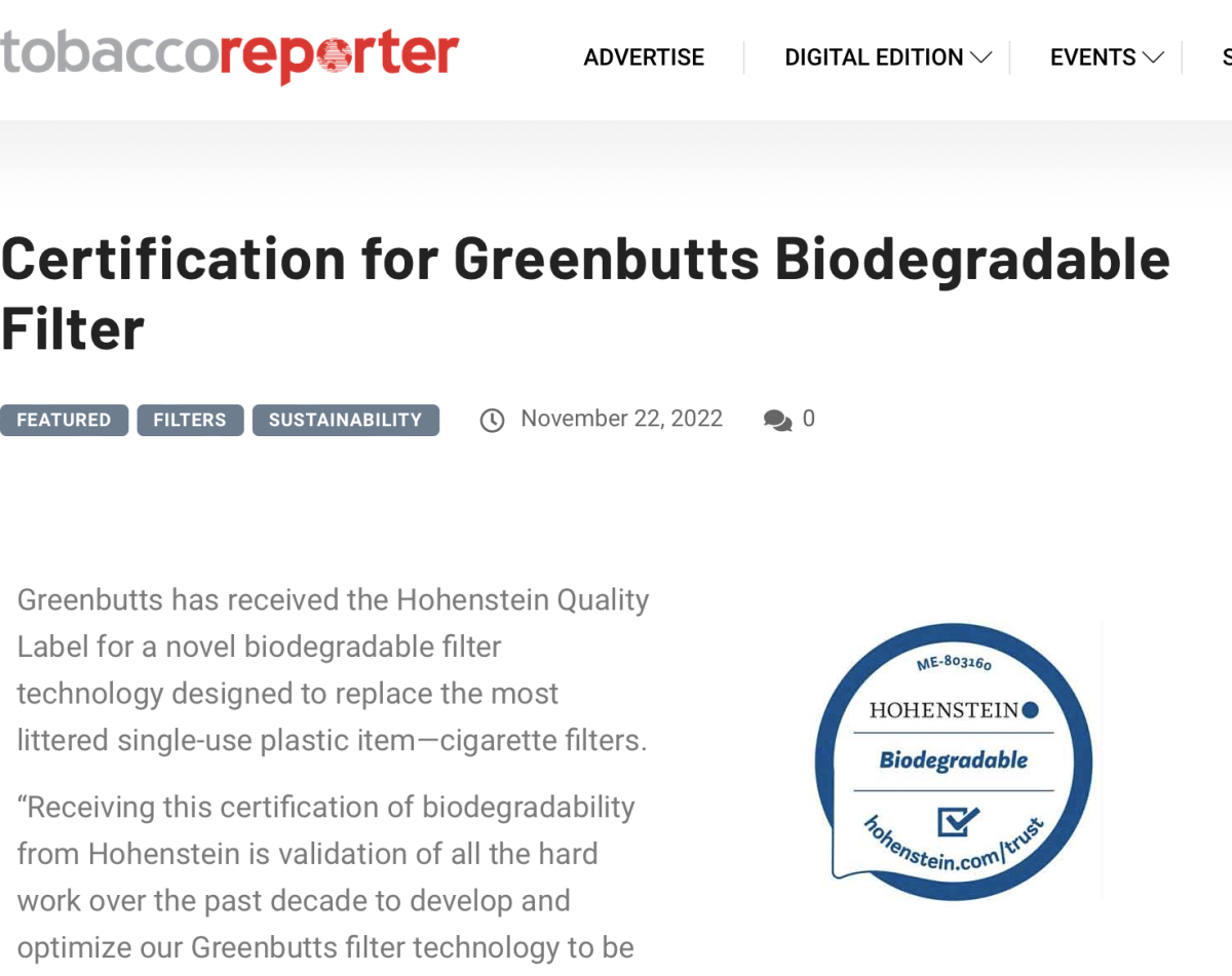 Greenbutts 凭借一种新型的可生物降解过滤技术获得了海恩斯坦质量标签,该技术旨在取代最容易胡乱丢弃的一次性塑料制品——香烟过滤嘴。