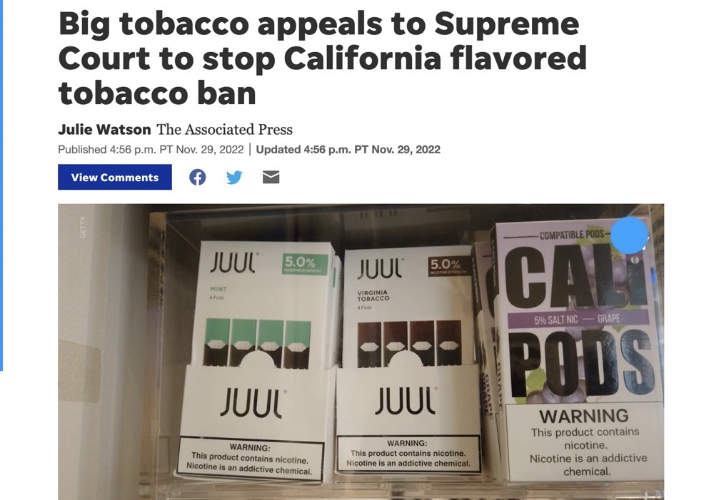 11月29日,雷诺公司与其他烟草公司联合向美国最高法院上诉,要求美国最高法院阻止加利福尼亚州对调味烟草产品禁令。